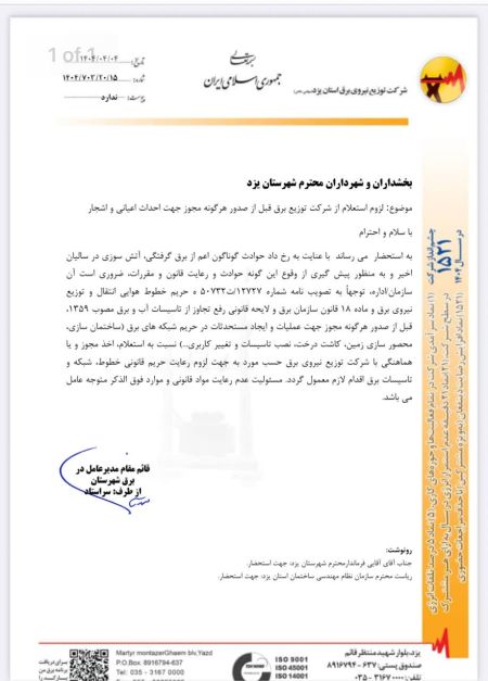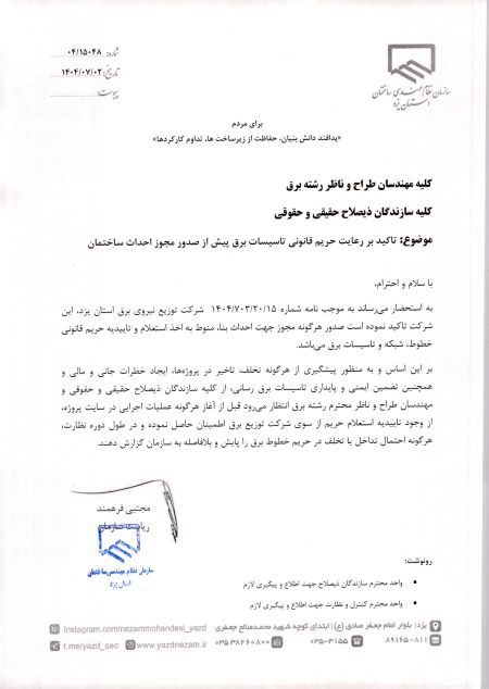 به موجب نامه شماره ۱۴۰۴/۷۰۳/۲۰/۱۵ شرکت توزیع نیروی برق استان یزد، این شرکت تاکید نموده است صدور هرگونه مجوز جهت احداث بنا، منوط به اخذ استعلام و تاییدیه حریم قانونی خطوط، شبکه و تاسیسات برق میباشد. بر این اساس و به منظور پیشگیری از هرگونه تخلف، تاخیر در پروژهها، ایجاد خطرات جانی و مالی و همچنین تضمین ایمنی و پایداری تاسیسات برق رسانی، از کلیه سازندگان ذیصلاح حقیقی و حقوقی و مهندسان طراح و ناظر محترم رشته برق انتظار میرود قبل از آغاز هرگونه عملیات اجرایی در سایت پروژه، از وجود تاییدیه استعلام حریم از سوی شرکت توزیع برق اطمینان حاصل نموده و در طول دوره نظارت، هرگونه احتمال تداخل یا تخلف در حریم خطوط برق را پایش و بلافاصله به سازمان گزارش دهند.