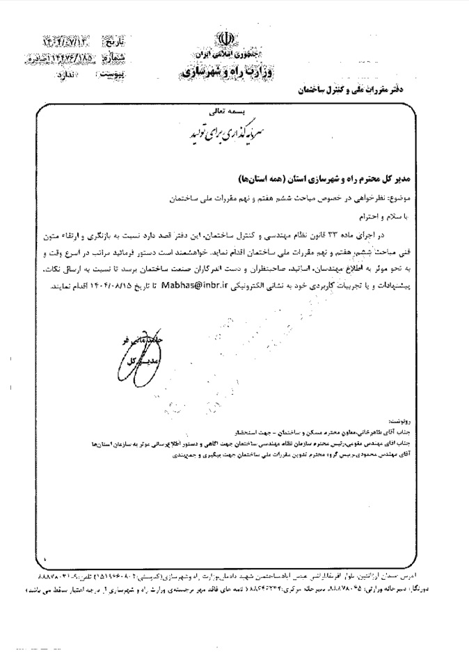 در اجرای ماده ۳۳ قانون نظام مهندسی و کنترل ساختمان، دفتر مقررات ملی و کنترل ساختمان قصد دارد نسبت به بازنگری و ارتفاء متون فنی مباحث ششم هفتم و نهم مقررات ملی ساختمان اقدام نماید.