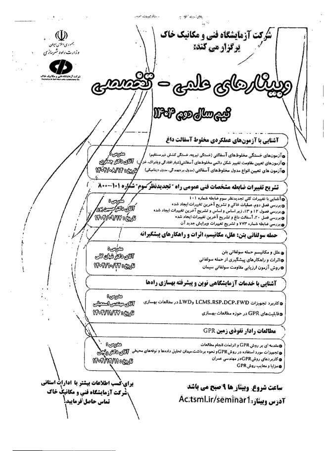 برنامه برگزاری نیم سال دوم 1404 وبینارهای علمی تخصصی شرکت آزمایشگاه فنی و مکانیک خاک با هدف ارتقای کیفیت و افزایش بهره وری طرح های عمرانی به منظور ترویج و انتقال دانش فنی و بهبود توانمندی های جامعه مهندسین و فعالان حوزه صنعت ساخت جهت اطلاع رسانی منتشر می گردد: