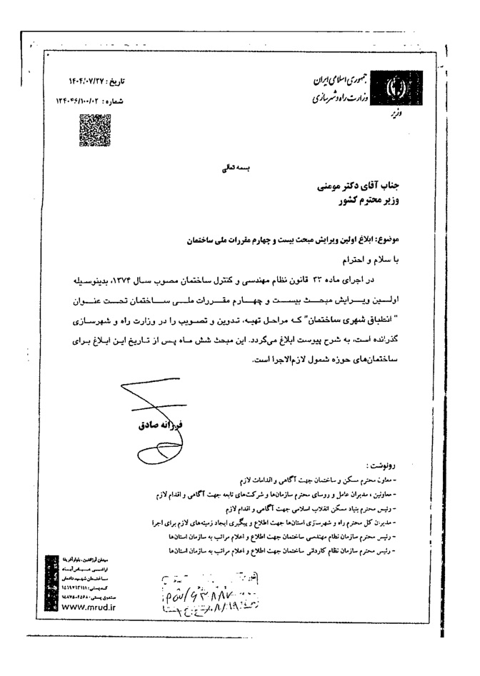در اجرای ماده ۲۳ قانون نظام مهندسی و کنترل ساختمان مصوب سال ۱۳۷۴، بدينوسيله اولين ويرايش مبحث بیست و چهارم مقررات ملی ساختمان تحت عنوان «انطباق شهری ساختمان» که مراحل تهیه تدوین و تصویب را در وزارت راه و شهرسازی گذرانده است به شرح ذیل ابلاغ و اطلاع رسانی میگردد. این مبحث شش ماه پس از تاریخ ابلاغ ( 27 فروردین 1405) برای ساختمانهای حوزه شمول لازم الاجرا است.