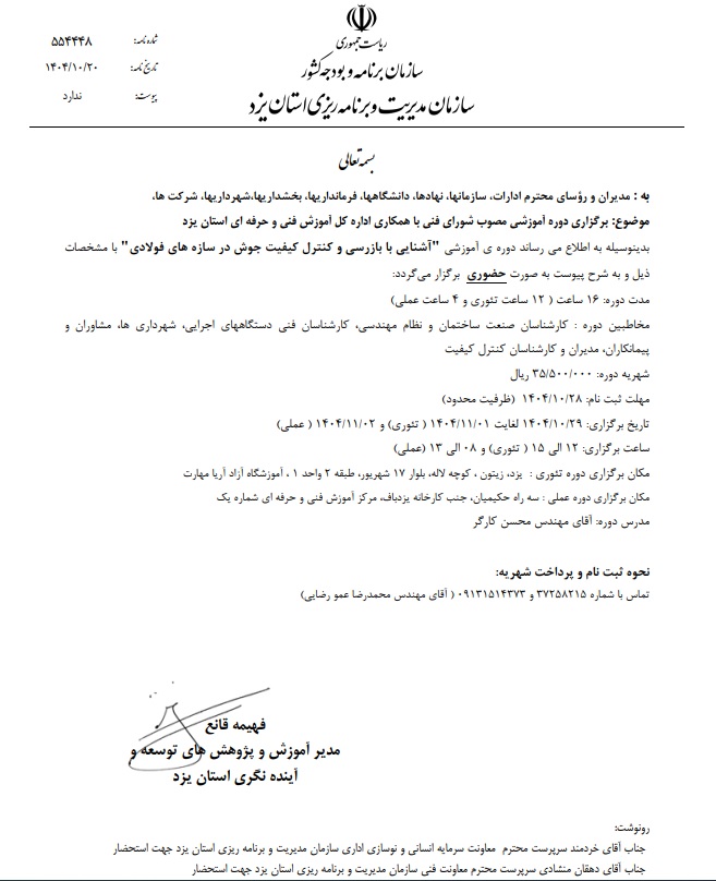 ثبت نام دوره ی آموزشی "آشنایی با بازرسی و کنترل کیفیت جوش در سازه های فولادی" با شرح و مشخصات ذیل به صورت حضوری تمدید شد: