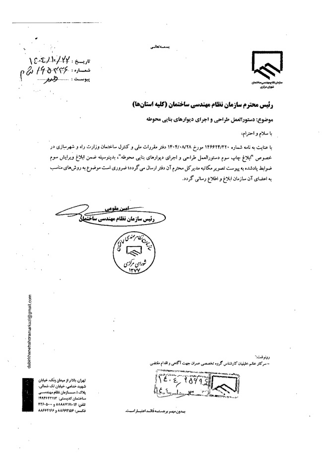 بدین وسیله ویرایش سوم ضوابط مذکور که بر اساس نتایج حاصل از نظارت عالیه بر ساخت و سازها و همچنین بررسی و اعمال نقطه نظرات دست اندرکاران و صاحب نظران بر روی نسخه اولیه آن اعمال گردیده جهت بهره برداری مهندسان . ذیربط ابلاغ می گردد.