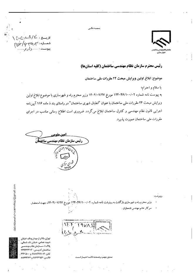 در اجرای ماده ۲۳ قانون نظام مهندسی و کنترل ساختمان مصوب سال ۱۳۷۴، بدينوسيله اولين ويرايش مبحث بیست و چهارم مقررات ملی ساختمان تحت عنوان «انطباق شهری ساختمان» که مراحل تهیه تدوین و تصویب را در وزارت راه و شهرسازی گذرانده است به شرح ذیل ابلاغ و اطلاع رسانی میگردد. این مبحث شش ماه پس از تاریخ ابلاغ ( 27 فروردین 1405) برای ساختمانهای حوزه شمول لازم الاجرا است.