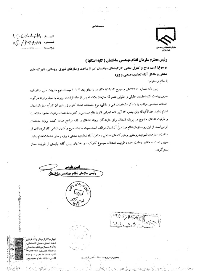 با توجه به نامه شماره ضروری است کلیه اعضای حقیقی و حقوقی عضو آن سازمان بلافاصله پس از عقد قرارداد مربوط به انجام و ارائه هرگونه خدمات مهندسی مراتب را با ذکر مشخصات فنی و ملکی، نوع خدمات، تعداد کار و زیربنای آن کتباً به سازمان استان اعلام نمایند.