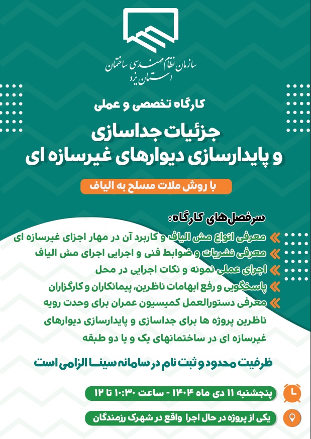 به منظور ارتقای دانش فنی و آشنایی عملی با روش های مهار دیوارهای غیرسازه ای با روش الیاف مش، کمیسیون عمران سازمان نظام مهندسی استان یزد در نظر دارد کارگاه عملی در این خصوص در محل یکی از پروژه های در حال اجرا برگزار نماید.