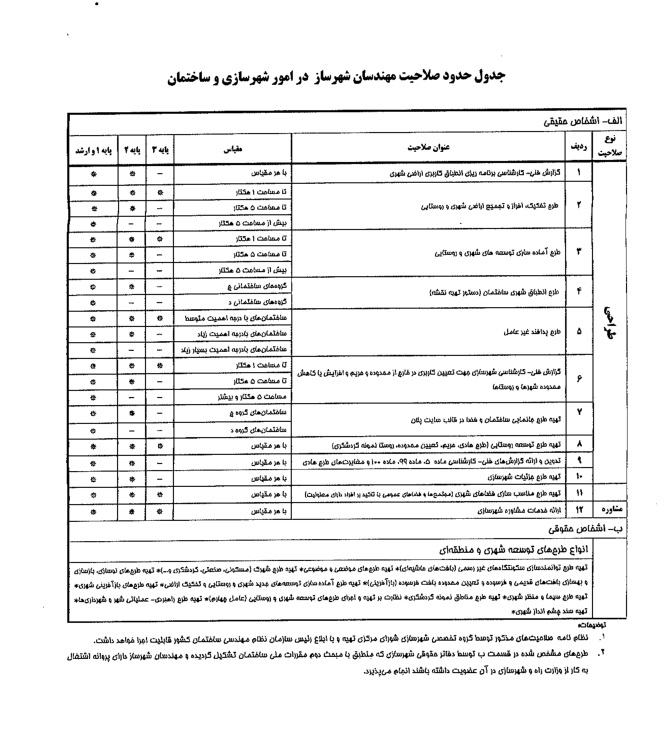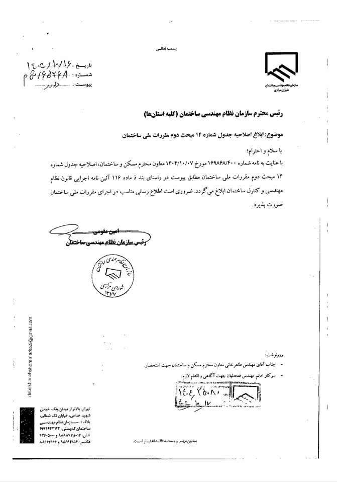با عنایت به نامه شماره 65268/ش م مورخ 1404/10/16 شورای مرکزی اصلاحیه جدول شماره ۱۴ مبحث دوم مقررات ملی ساختمان مطابق پیوست در راستای بند ذ ماده ۱۱۶ آئین نامه اجرایی قانون نظام مهندسی و کنترل ساختمان ابلاغ می گردد.