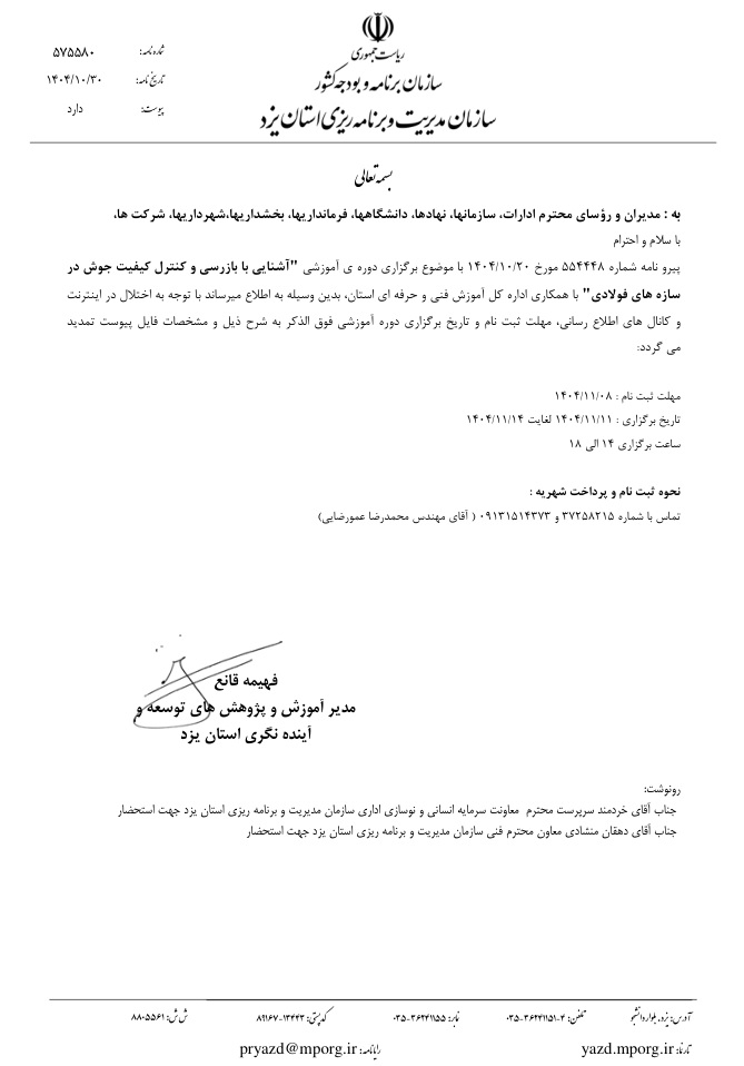 ثبت نام دوره ی آموزشی "آشنایی با بازرسی و کنترل کیفیت جوش در سازه های فولادی" با شرح و مشخصات ذیل به صورت حضوری تمدید شد: