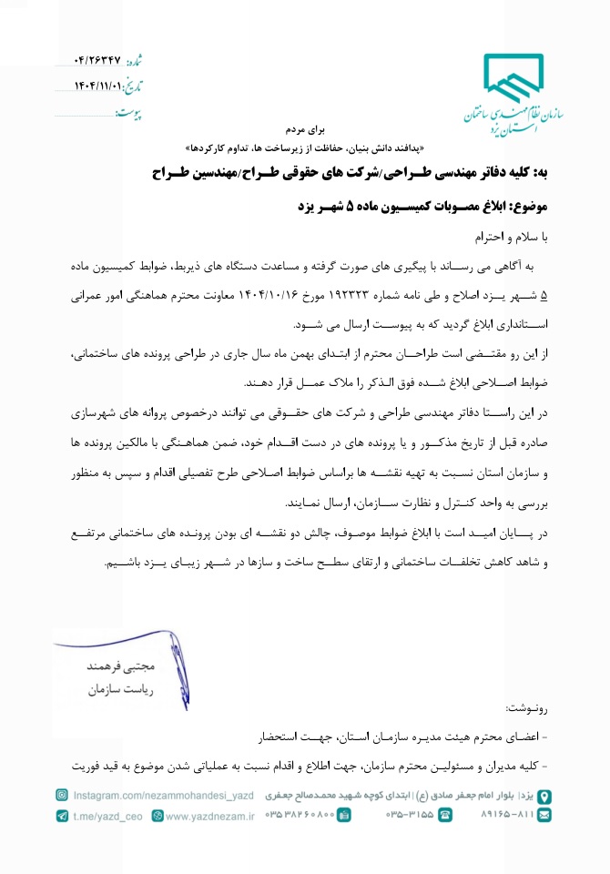 با پيگيری های صورت گرفته و مساعدت دستگاه های ذيربط، ضوابط كميسيون ماده ۵ شهر يزد اصلاح و طی نامه شماره ۱۹۲۳۲۳ مورخ ۱۴۰۴/۱۰/۱۶ معاونت محترم هماهنگی امور عمرانی اسـتانداری ابلاغ گرديد كه به پيوست اطلاع رسانی می شود.