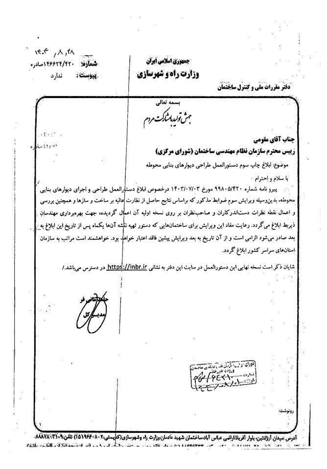 بدین وسیله ویرایش سوم ضوابط مذکور که بر اساس نتایج حاصل از نظارت عالیه بر ساخت و سازها و همچنین بررسی و اعمال نقطه نظرات دست اندرکاران و صاحب نظران بر روی نسخه اولیه آن اعمال گردیده جهت بهره برداری مهندسان . ذیربط ابلاغ می گردد.