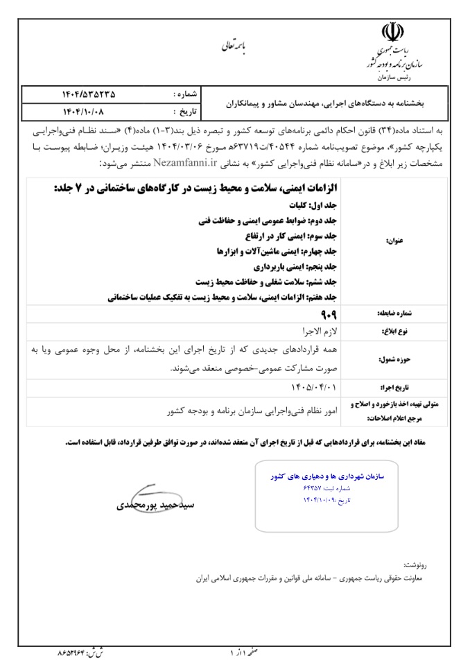 تصویر بخشنامه شماره ۱۴۰۴/۵۳۵۲۳۵ مورخ ۱۴۰۴/۱۰/۸ سازمان برنامه و بودجه کشور با موضوع "الزامات ایمنی،سلامت ومحیط زیست در کارگاه های ساختمانی" در ۷ جلد مستند به ماده ۳۴ قانون احکام دائمی برنامه های توسعه کشور و تبصره ذیل بند ۱-۳ از ماده ۴ "سند نظام فنی واجرایی یکپارچه کشور" موضوع تصویب نامه شماره /۴۰۵۴۴ ت ۶۳۷۱۹ هـ مورخ ۱۴۰۴/۳/۶ هیئت محترم وزیران، اطلاع رسانی می گردد.